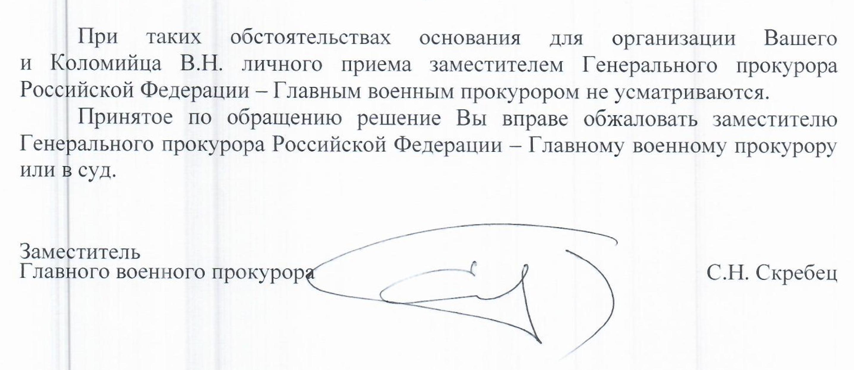 Дополнительная информация. Наше обращению в Администрацию Президента было перенаправлено в Главную военную прокуратуру. С нами связался прокурор и просил о личной встрече чтобы письменно зафиксировать наши претензии. Решение о встрече с прокурором еще не принято. Ответ им подписанный не даст права на встречу с Генпрокурором.